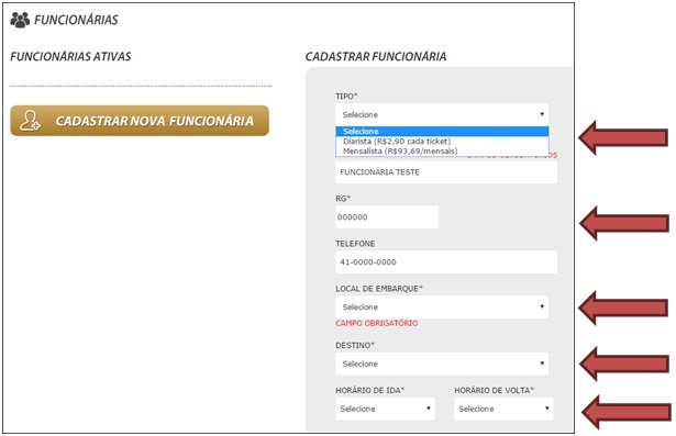 - Após esse comando o cadastro da sua funcionaria já estará realizado, caso ela seja DIARISTA estará ativa a opção para que você possa comprar os tickets e utilizar o transporte, e se for MENSALISTA, estará liberado a opção para pagamento da mensalidade.